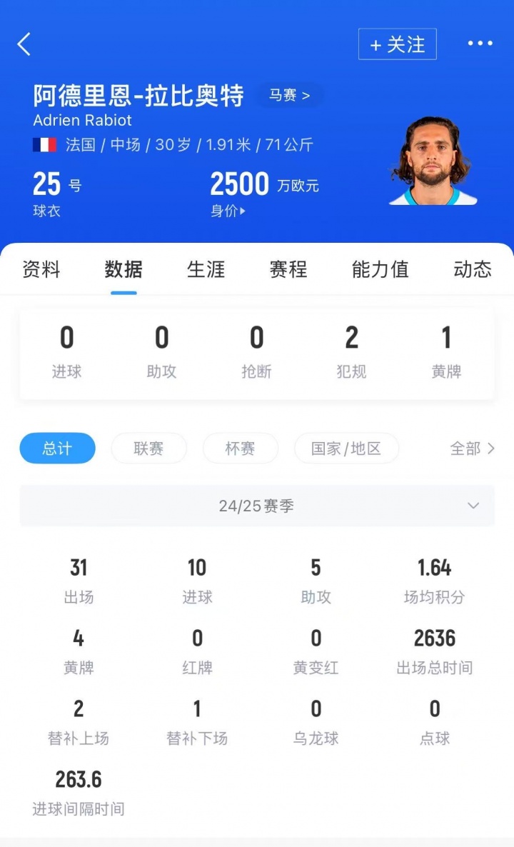 拉比奥特现年30岁,法国中场,他在去年自由身加盟马赛。上赛季为球队总计出场31次,贡献10球5助。目前球员德转身价为2500万欧元。